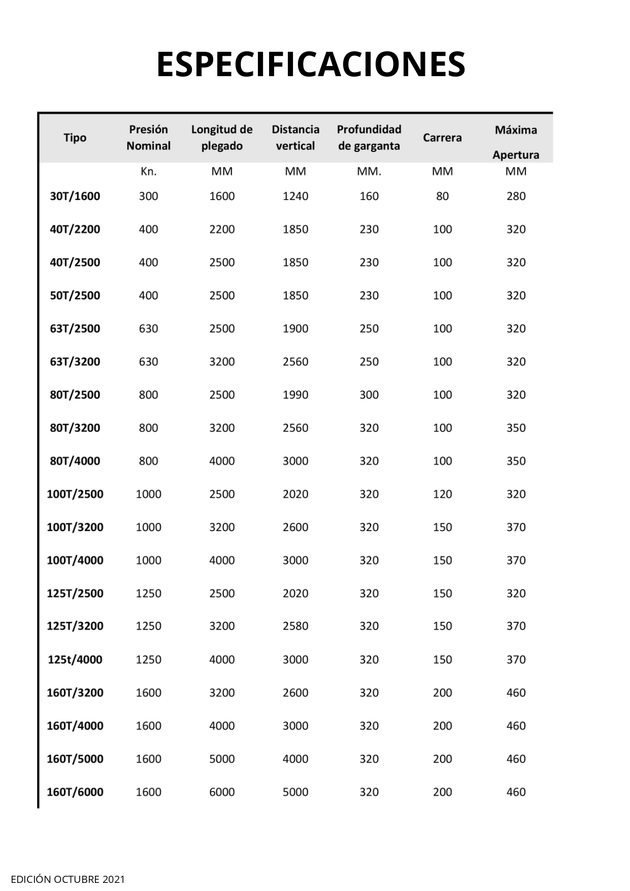 Contamos con tonelajes desde 30 T hasta 1500T con dimensión en mesa de trabajo de 4 pies hasta 20 pies.