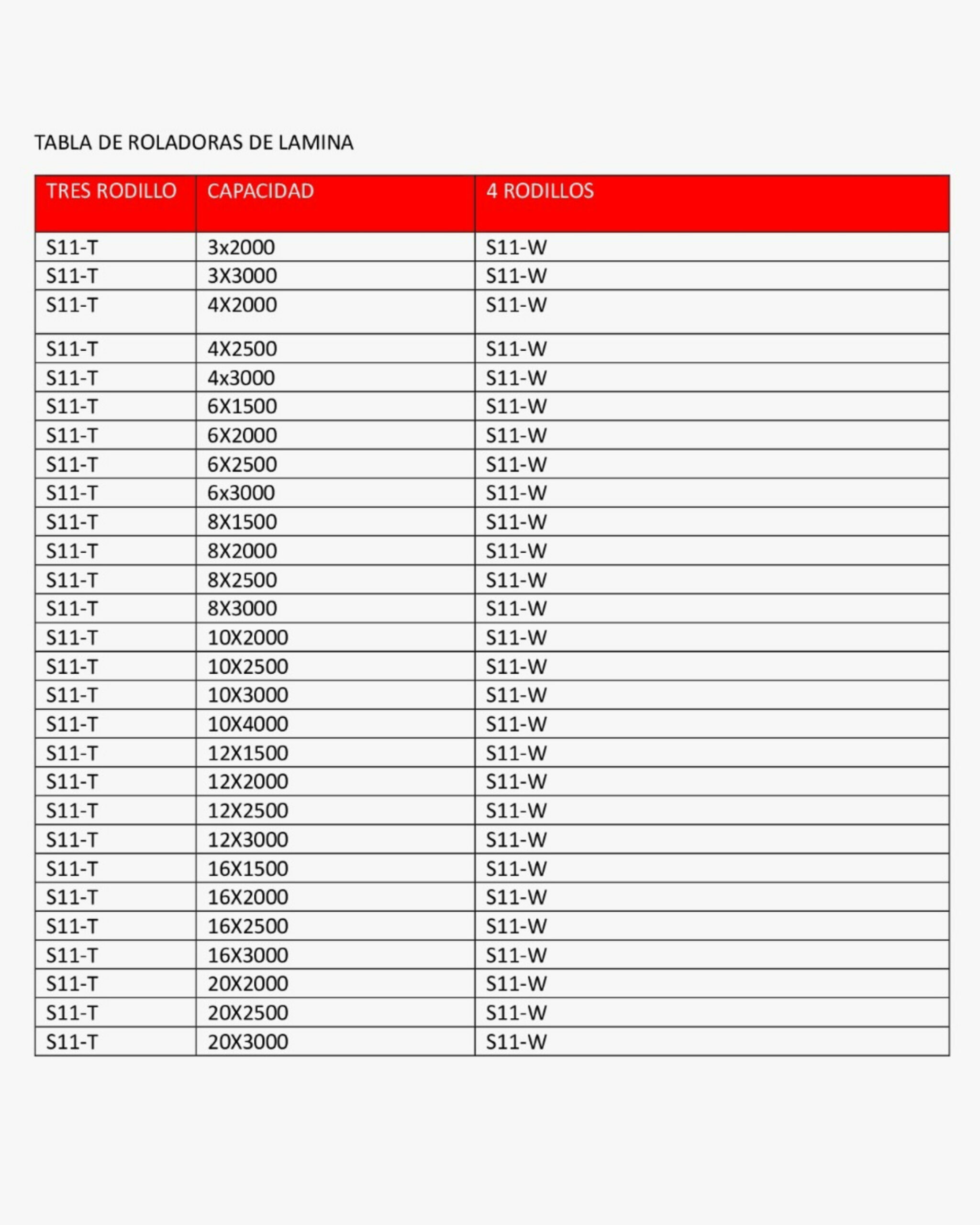 Entre los equipos disponibles tenemos: Roladoras de lámina en 3 y 4 rodillos, Roladoras de placa de geometría variable con 3 rodillos en diferentes capacidades, hidráulica de 4 rodillos con capacidad de pre-curvado. Los rodillos tienen un movimiento lineal las medidas disponibles con capacidad de curvado desde 25mm hasta 300mm y con longitudes desde 1000mm hasta 6000mm de largo.